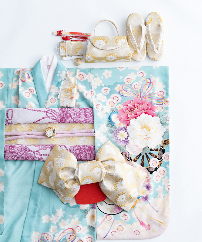 淡い水色の地に、華やかな花々と源氏車の文様が映える気品あるお着物。大輪の牡丹や菊が優雅に咲き誇り、伝統美の中に愛らしさが宿ります。金彩の帯やリボンも上品で、晴れの日にふさわしい華やかさを演出。可憐で品のある装いをお探しの方にぴったりの一着です。