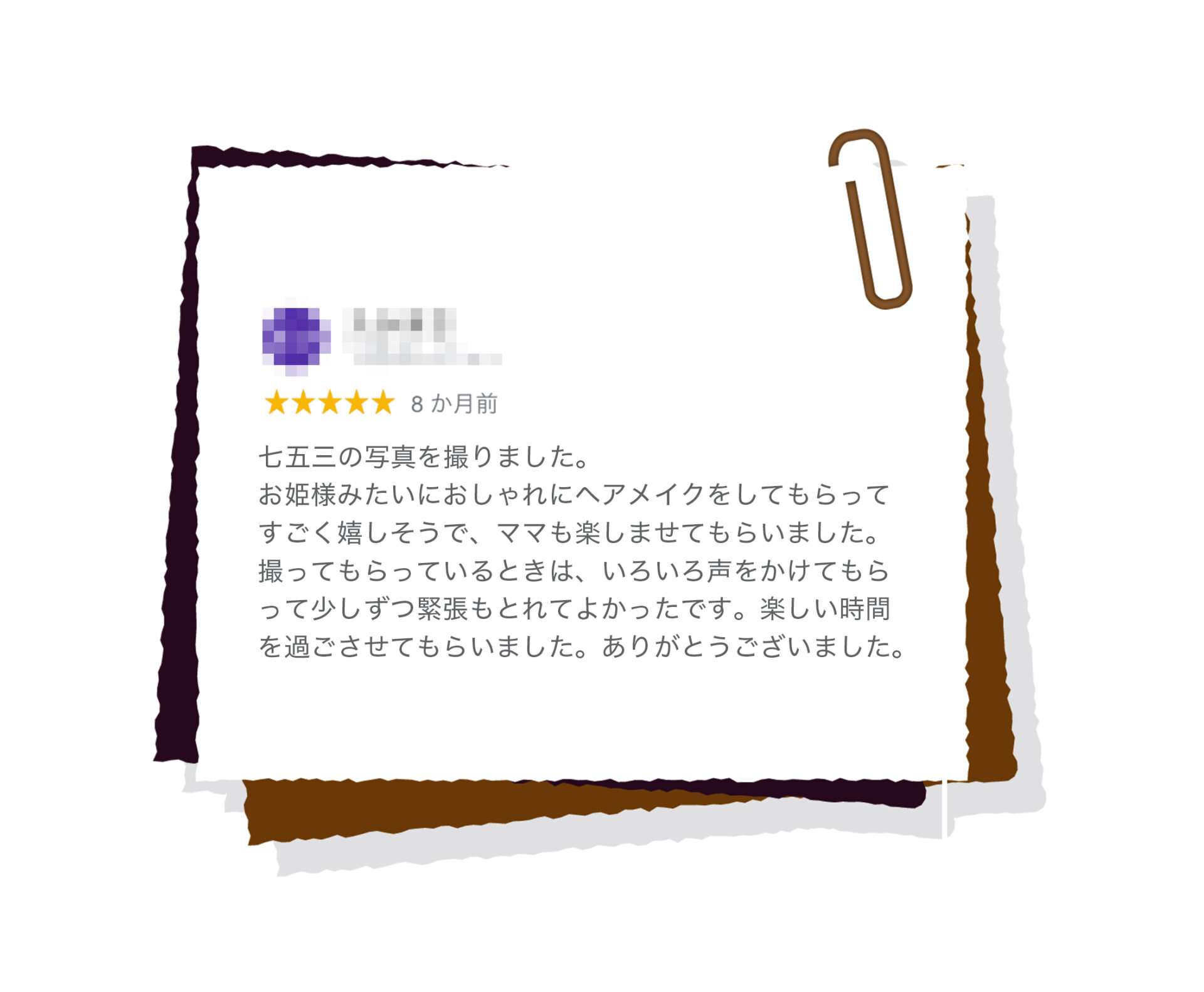 お姫様みたいにおしゃれにヘアメイクをしてもらってすごく嬉しそうで、ママも楽しませてもらいました。撮ってもらっているときは、いろいろ声をかけてもらって少しずつ緊張もとれてよかったです。楽しい時間を過ごさせてもらいました。ありがとうございました。