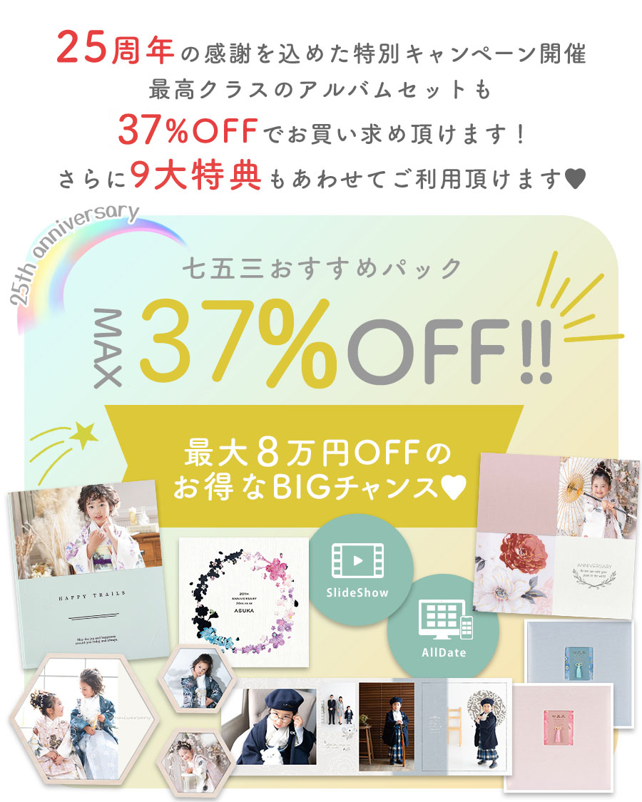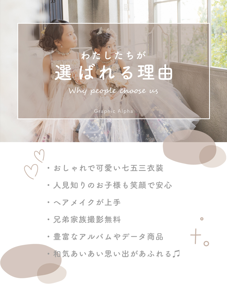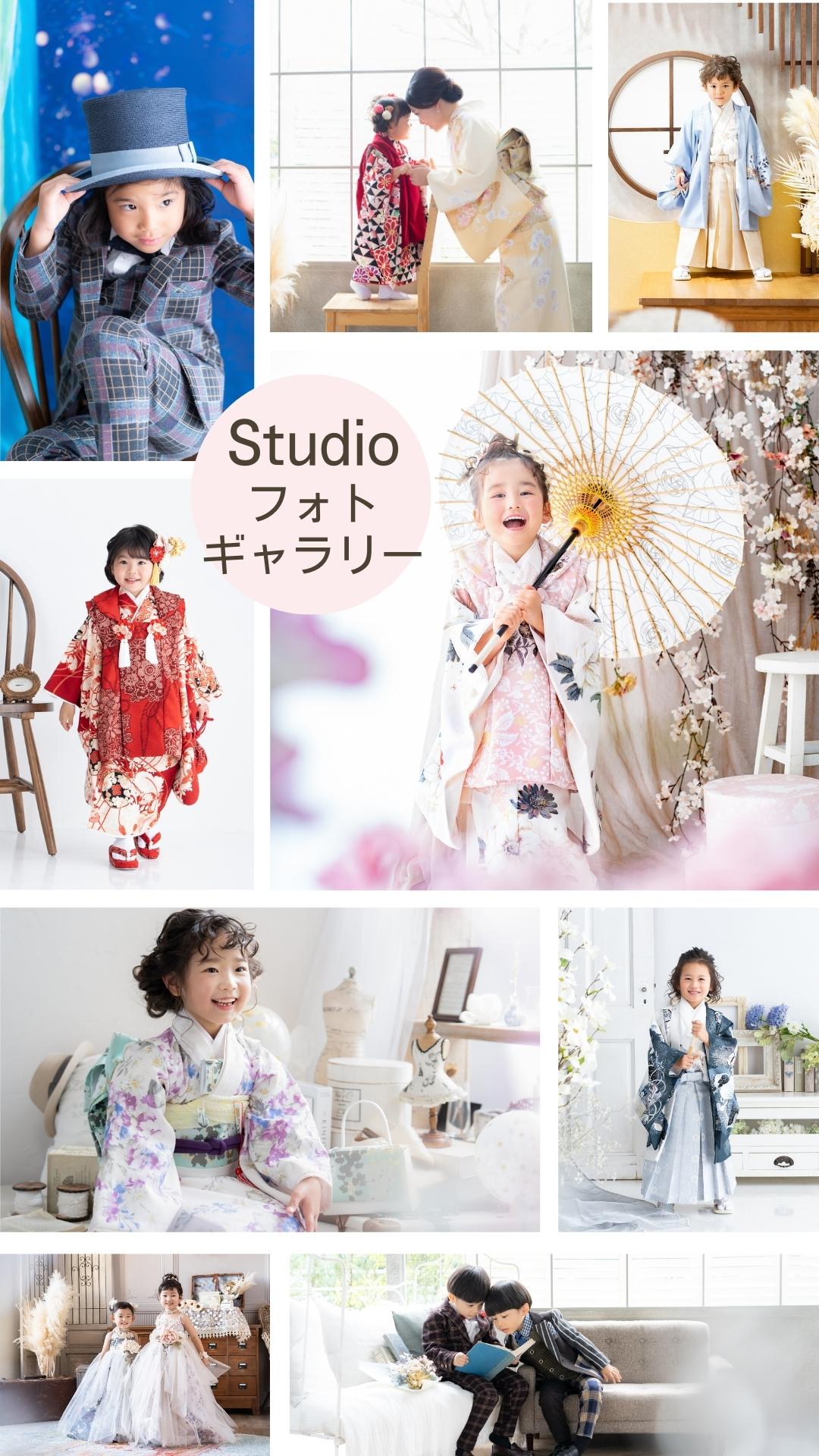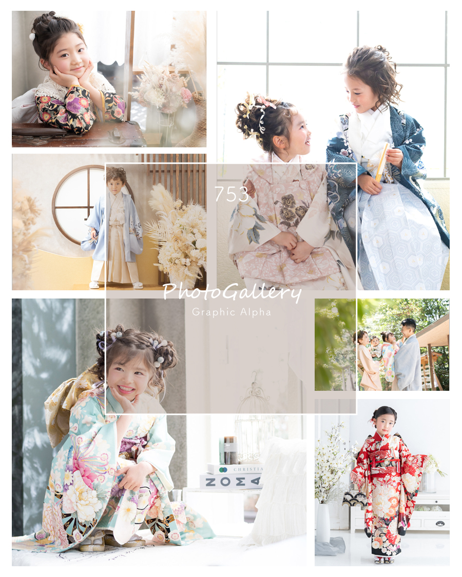 着物姿やちょっぴり大人びた表情はもちろん、ご家族・ご兄弟とのふれあいカットまで、七五三の特別な一日をたっぷりと残せるアルバムをご用意しています。