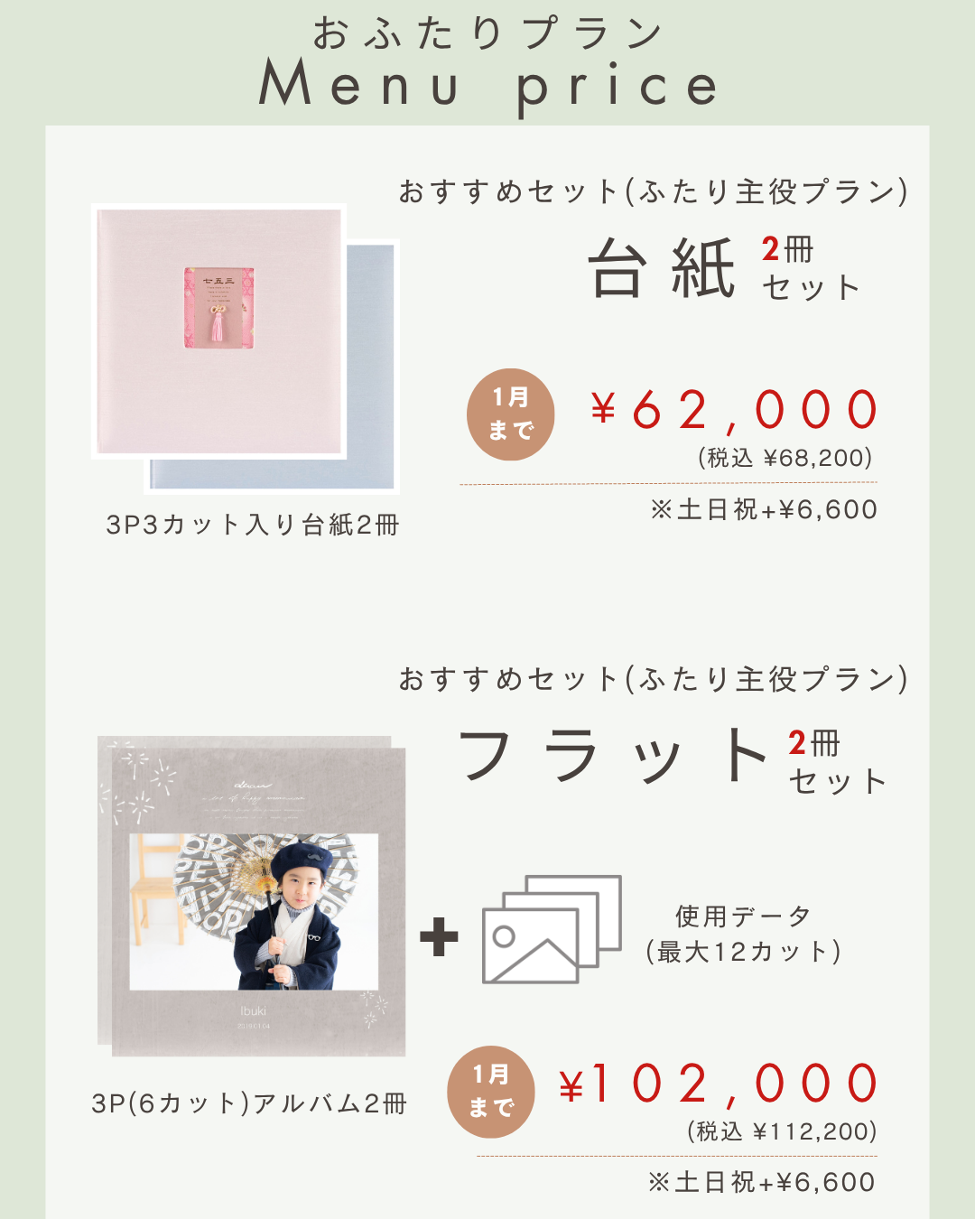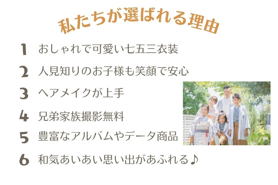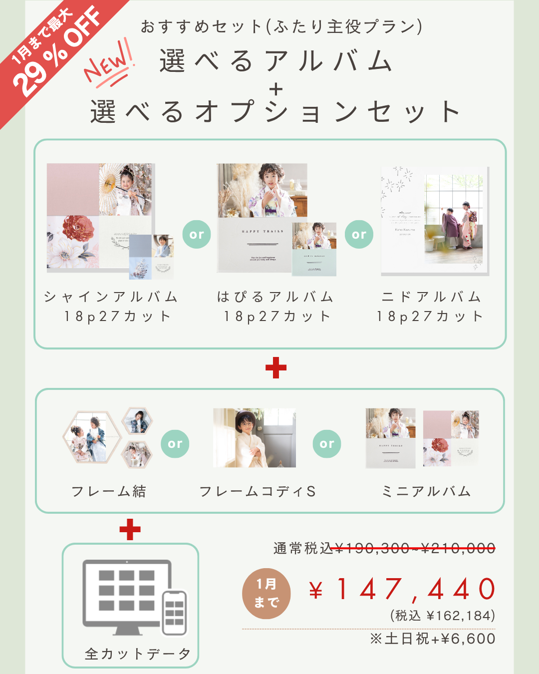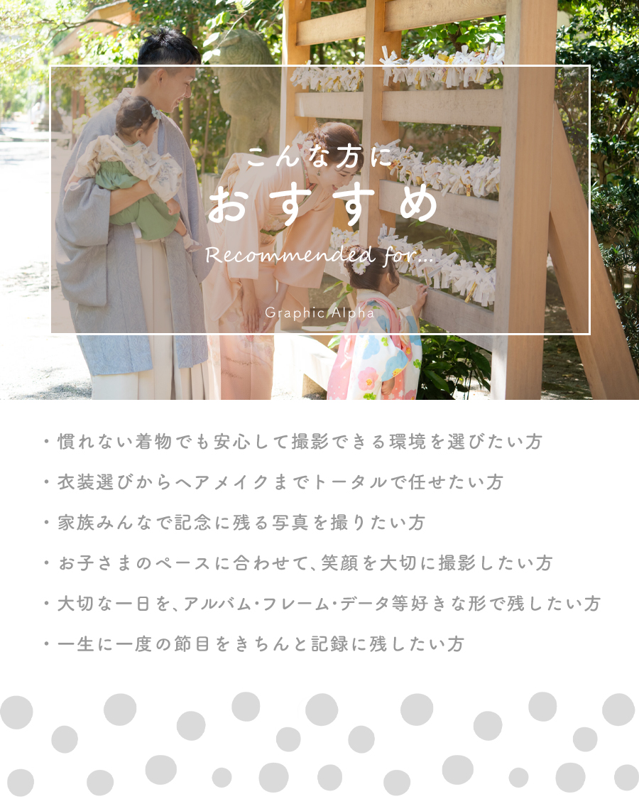 着物姿やちょっぴり大人びた表情はもちろん、ご家族・ご兄弟とのふれあいカットまで、七五三の特別な一日をたっぷりと残せるアルバムをご用意しています。