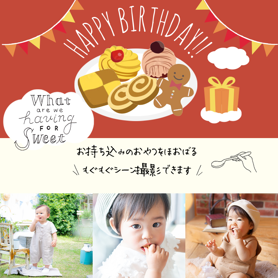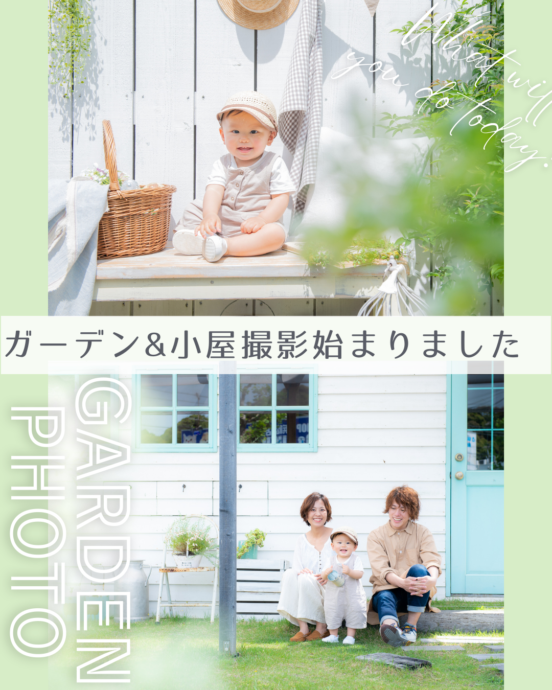 おしゃれなスタジオセットや、プチロケーションフォト用のナチュラルガーデン。お子様のバースディをhappyに盛り上げる、そんな脇役たちを貸切で。