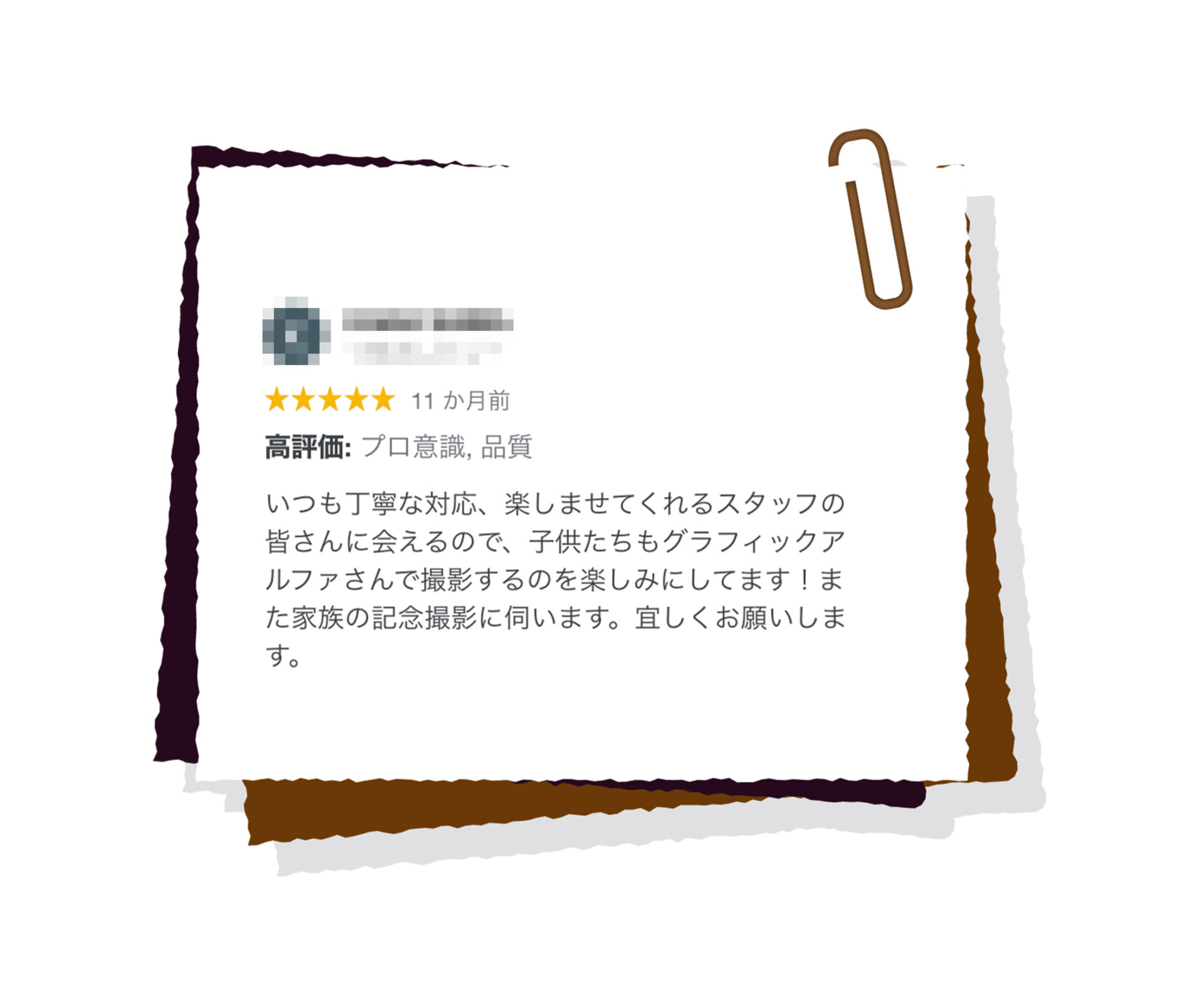 いつも丁寧な対応、楽しませてくれるスタッフの皆さんに会えるので、子供たちもグラフィックアルファさんで撮影するのを楽しみにしてます!また家族の記念撮影に伺います。宜しくお願いします