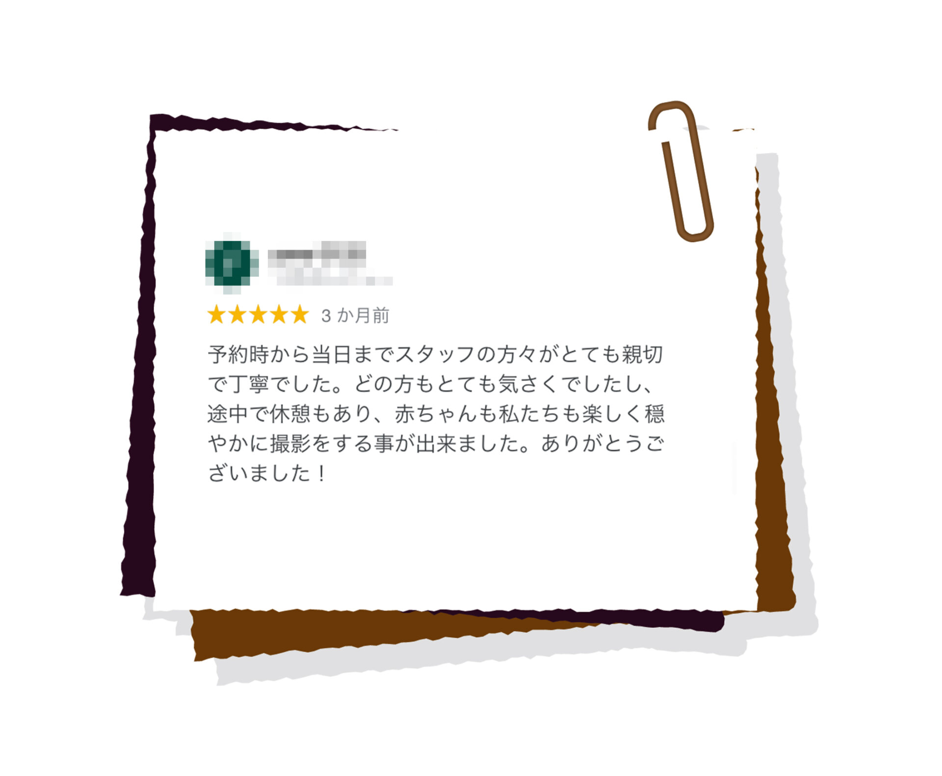 予約時から当日までスタッフの方々がとても親切で丁寧でした。どの方もとても気さくでしたし、途中で休憩もあり、赤ちゃんも私たちも楽しく穏やかに撮影をする事が出来ました。ありがとうございました!