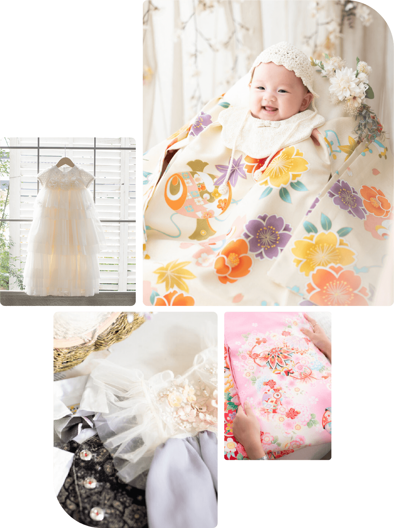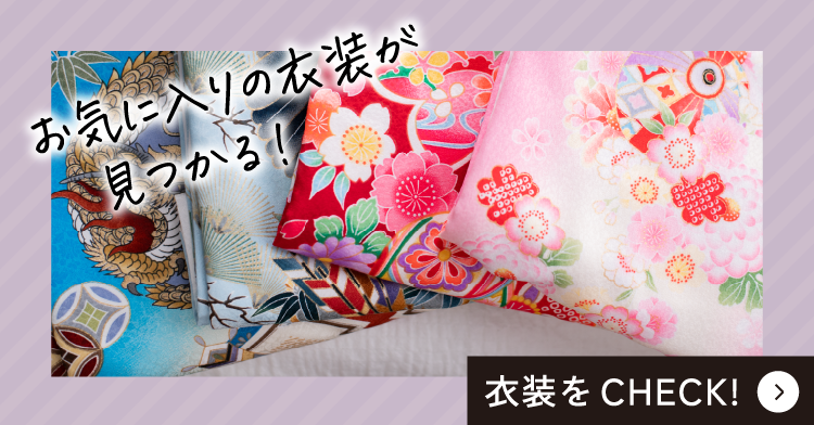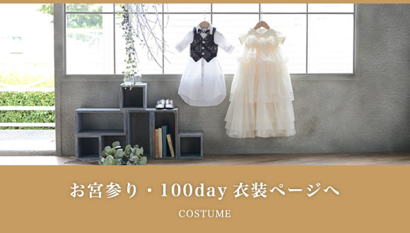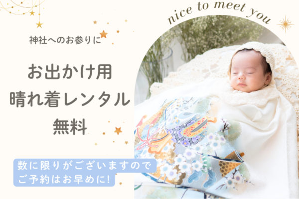 赤ちゃん用のかわいい晴れ着やドレスなどが無料でご利用いただけます。初めて迎えるハレの日らしい華やかなコーディネイトです。