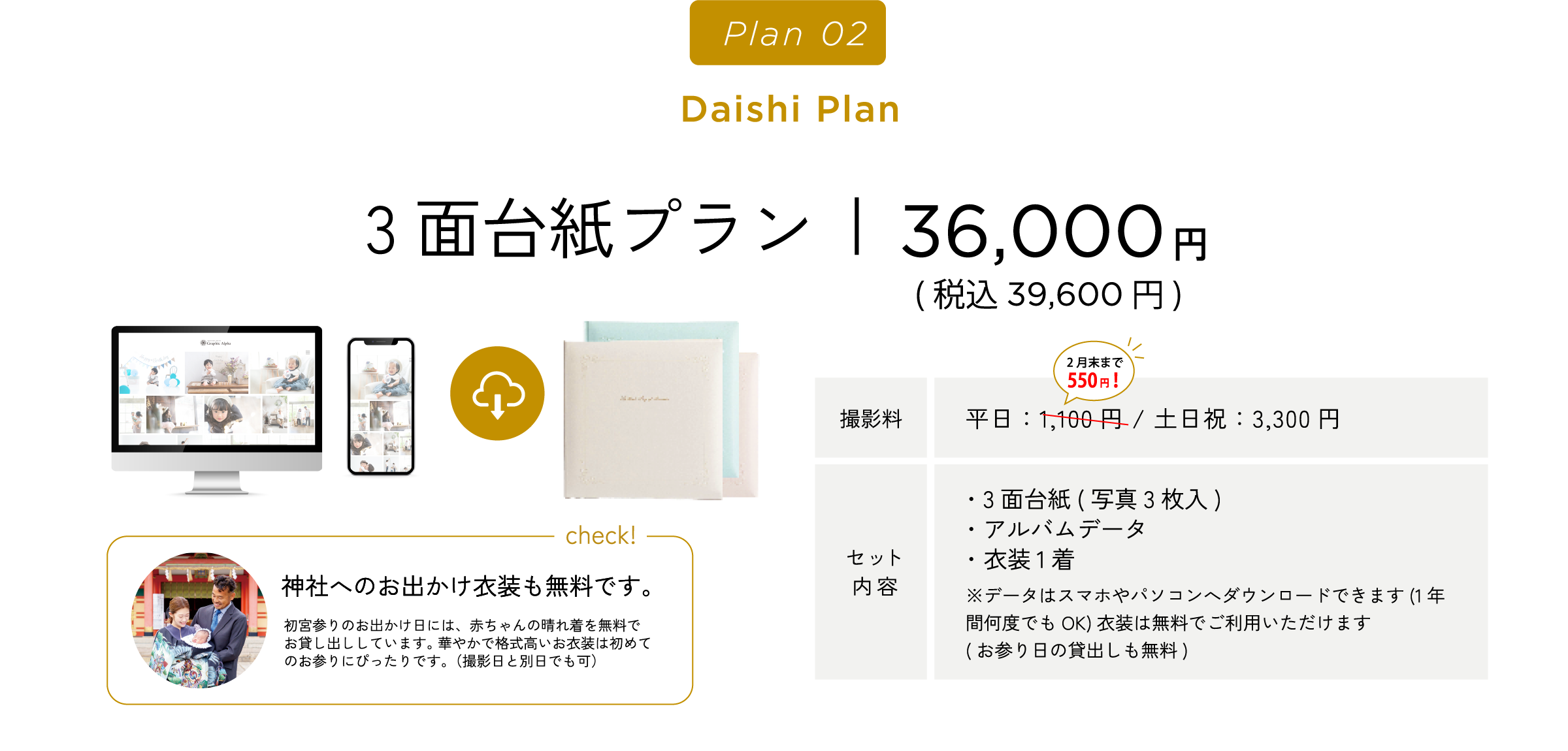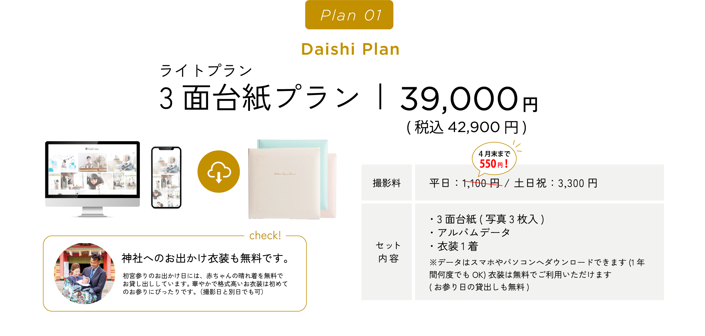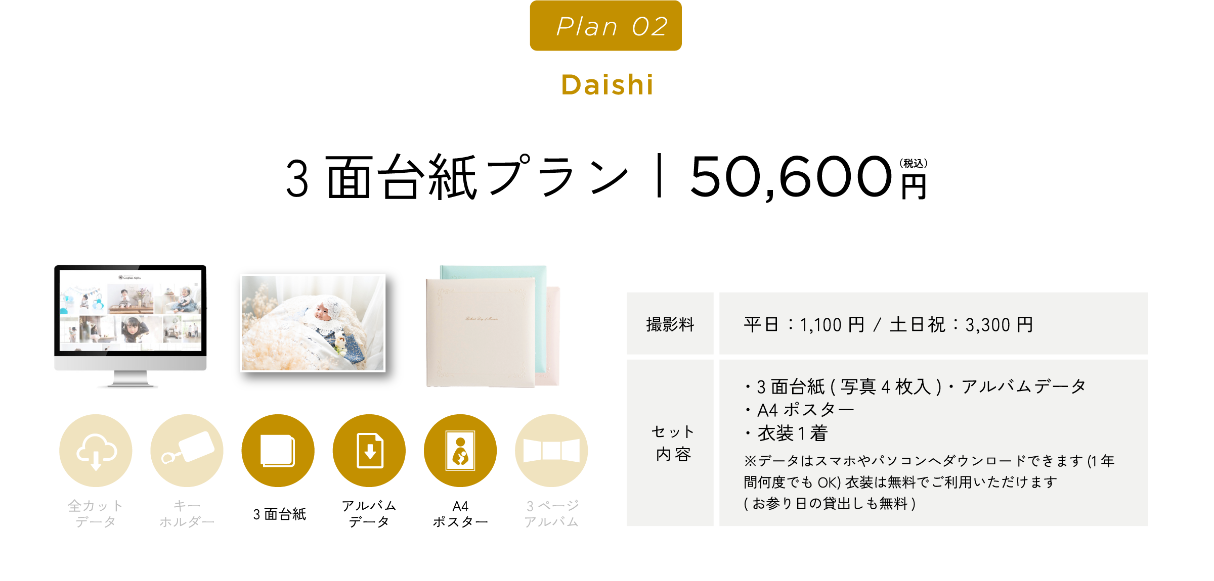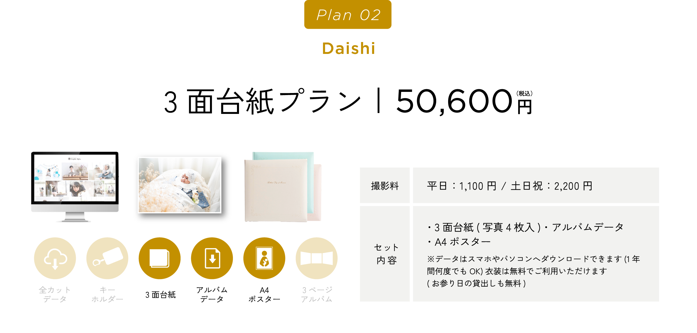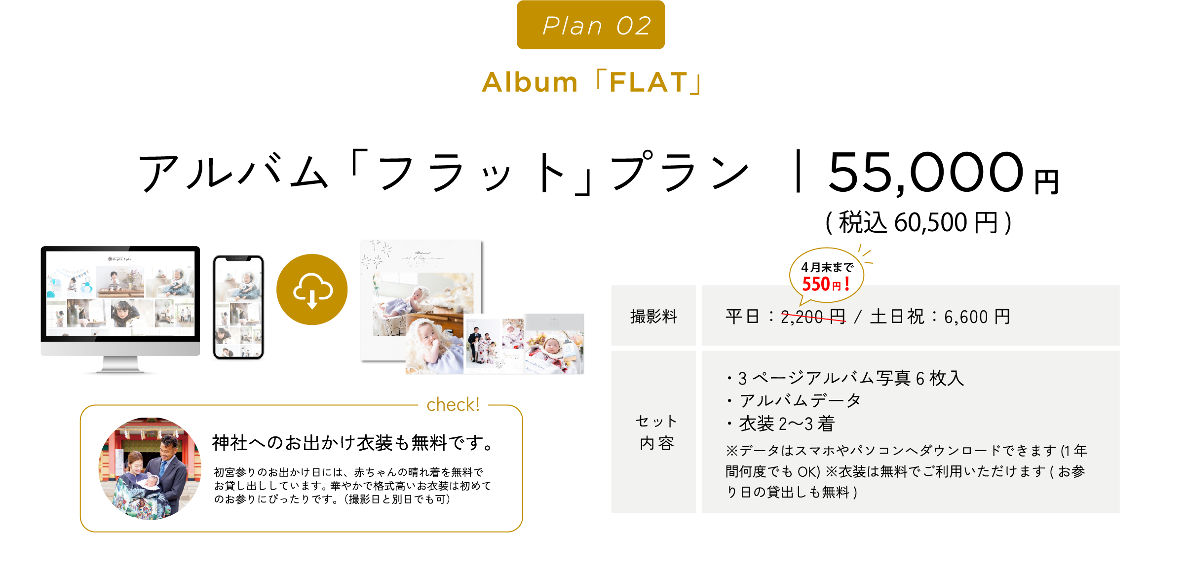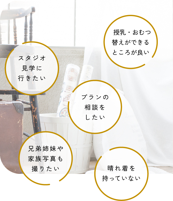 グラフィックアルファはこれらすべてに対応しております。ご相談のみでのご来店や、衣装・スタジオ見学でのご来店も受け付けております。