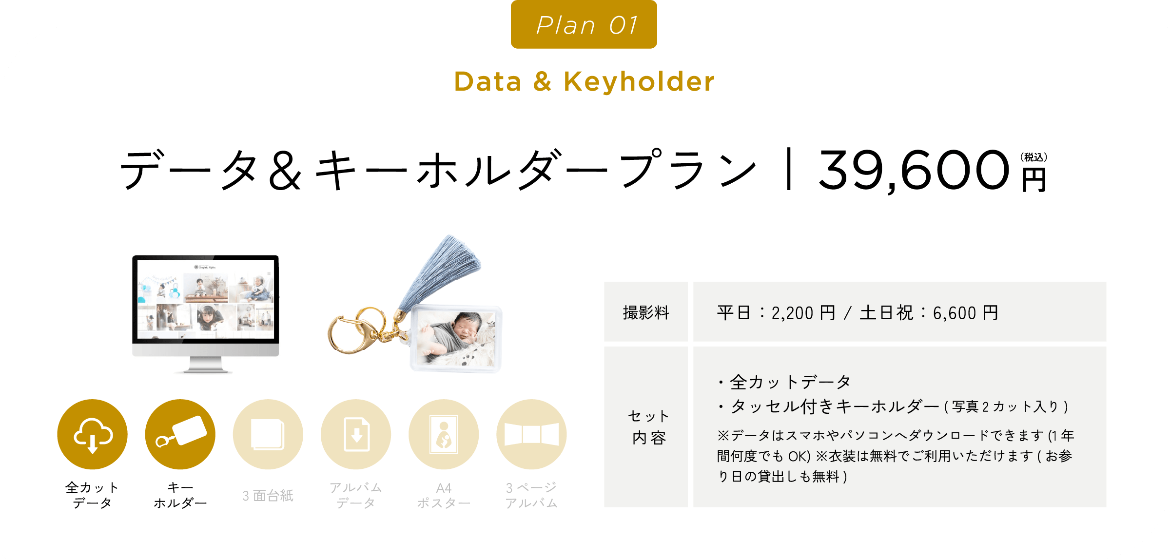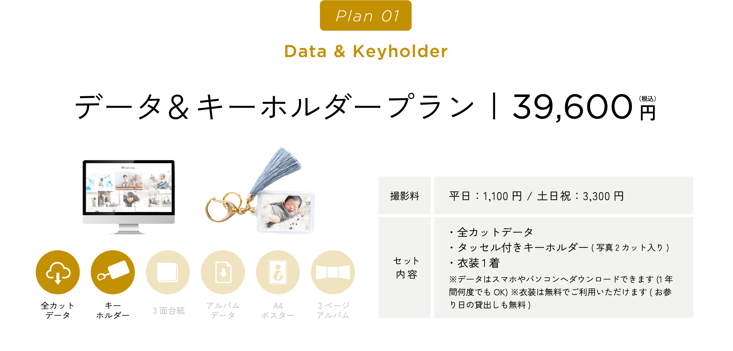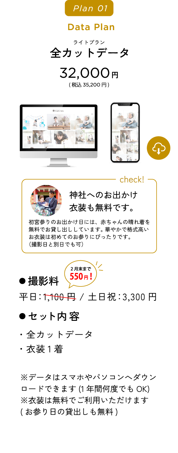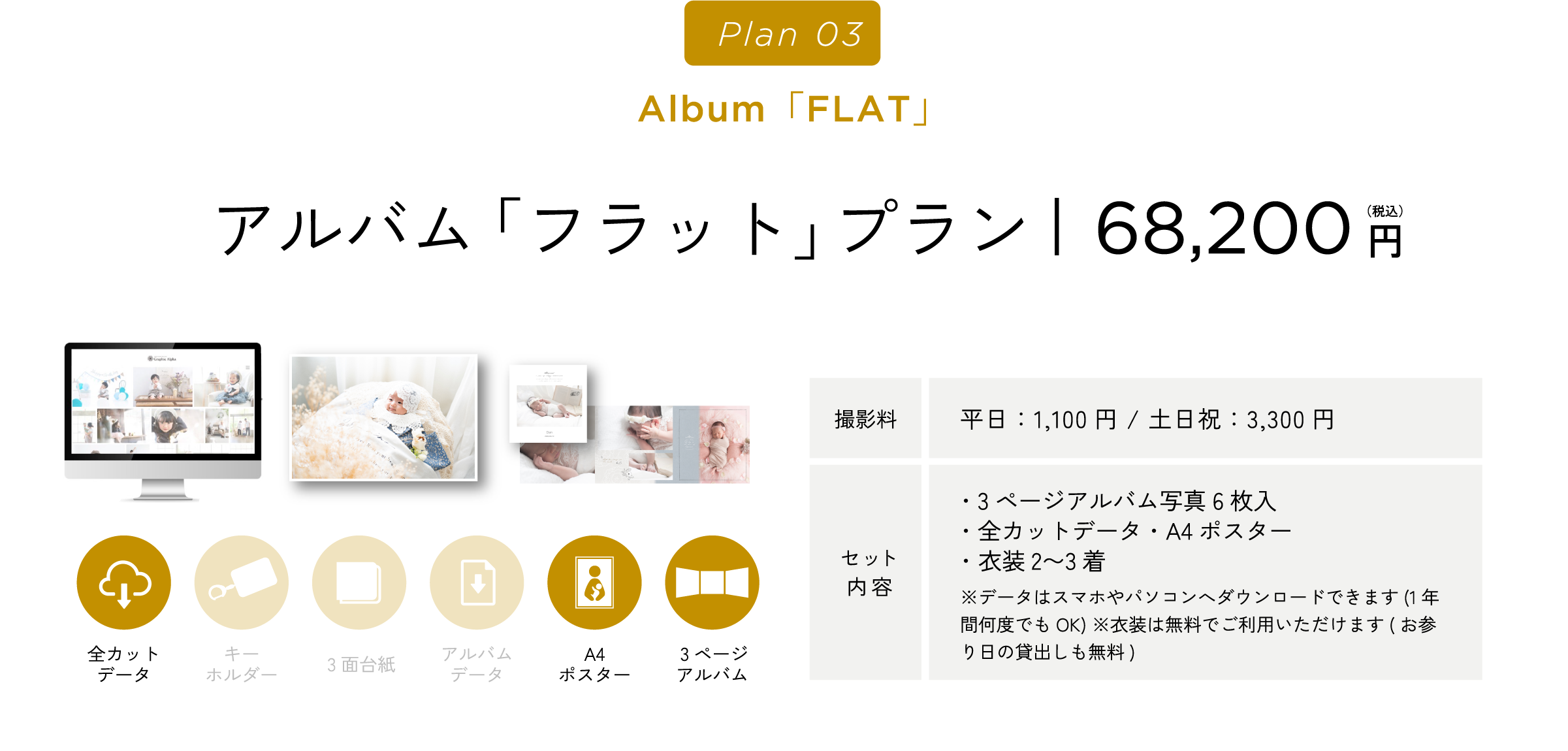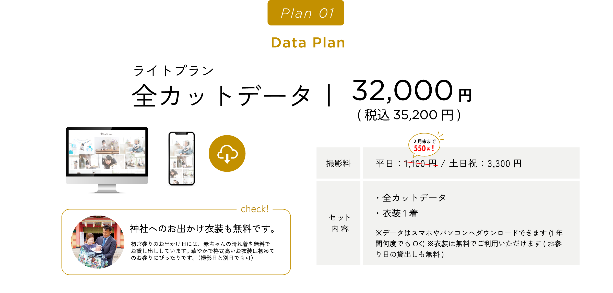 グラフィックアルファはこれらすべてに対応しております。ご相談のみでのご来店や、衣装・スタジオ見学でのご来店も受け付けております。