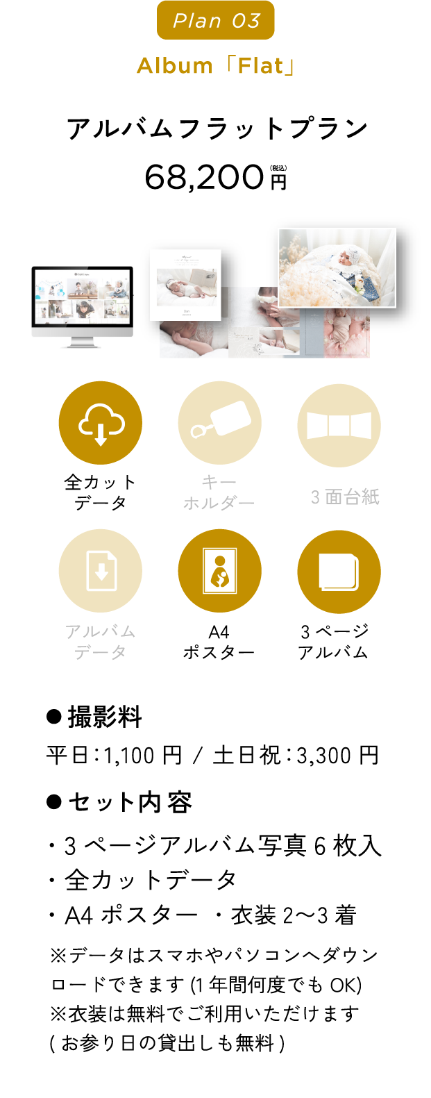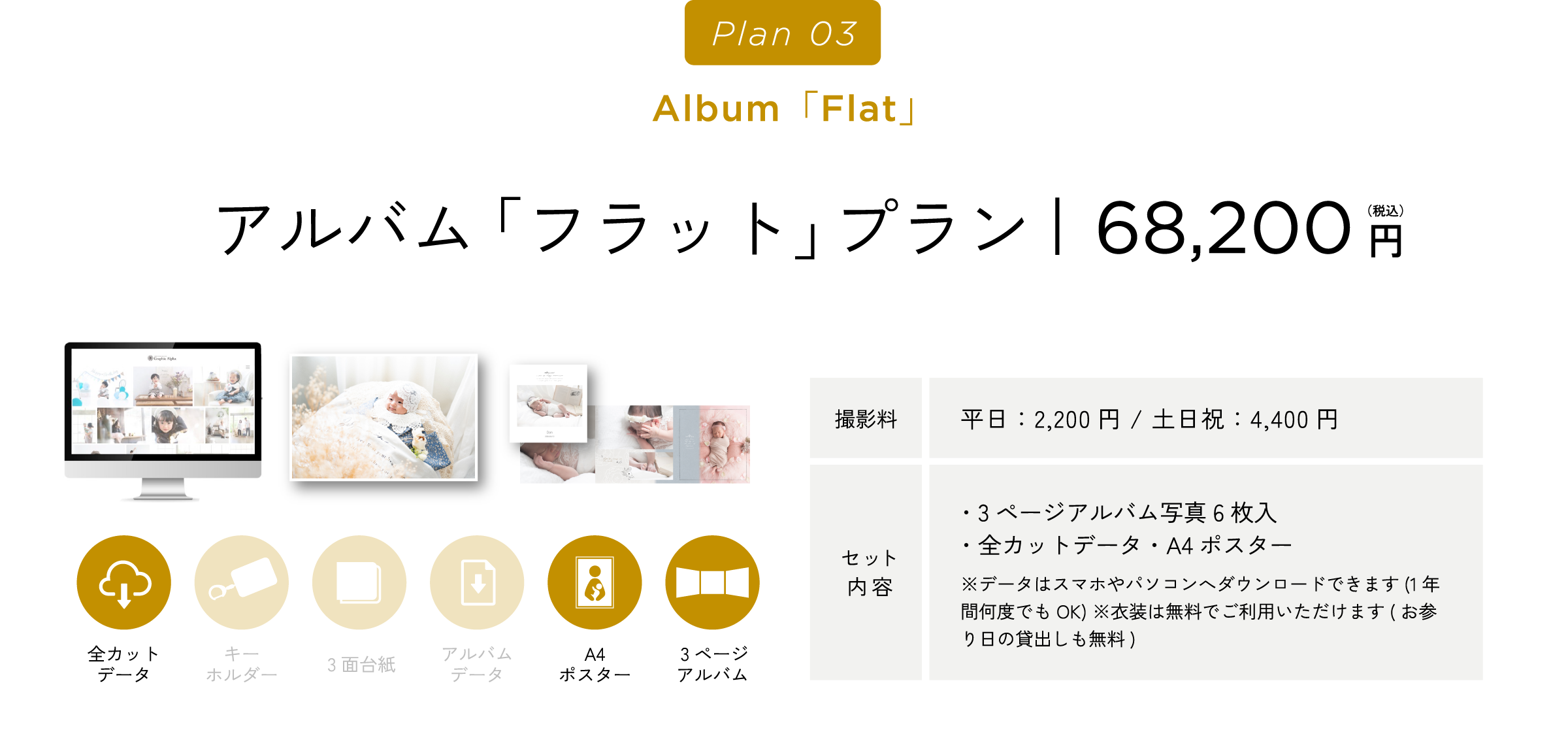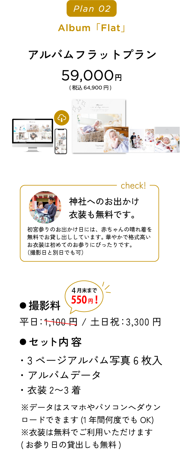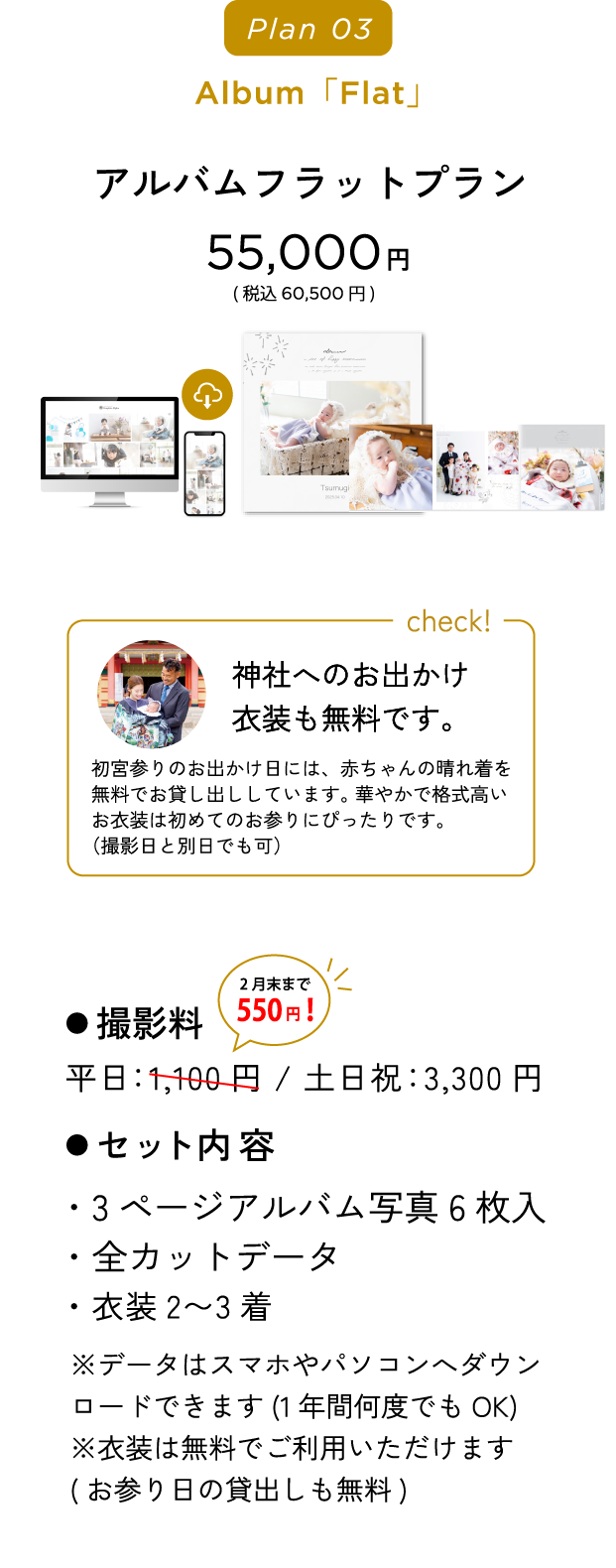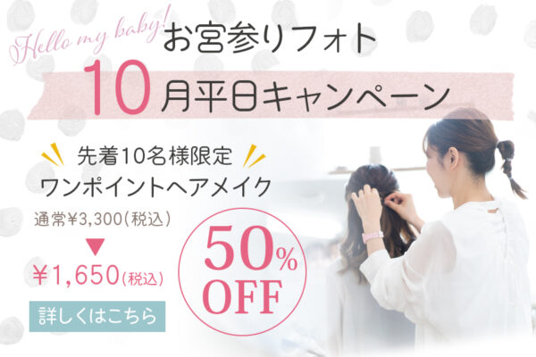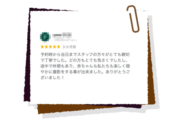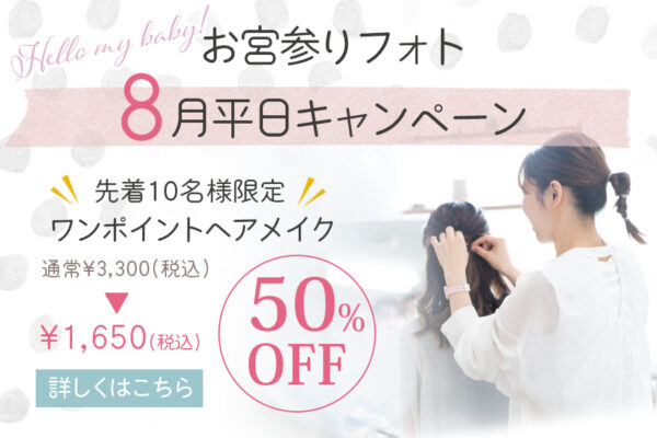 『赤ちゃんの撮影は平日ママとご来店いただきゆっくり撮影して、パパもご一緒の家族写真は土日祝に撮影、そのままお出掛け』というプランも人気です。(平日料金が一回のみでOK)詳しくはお電話でお問い合わせください。