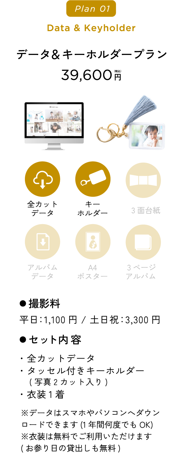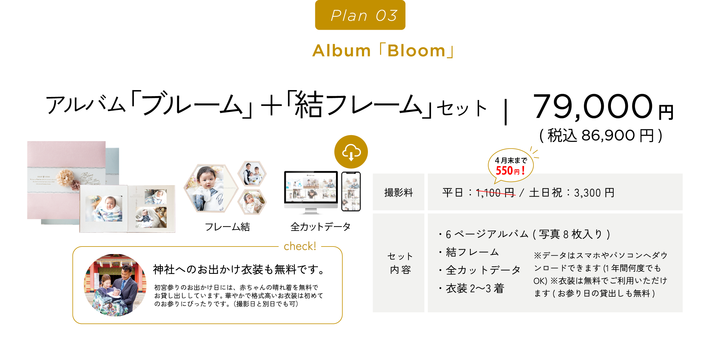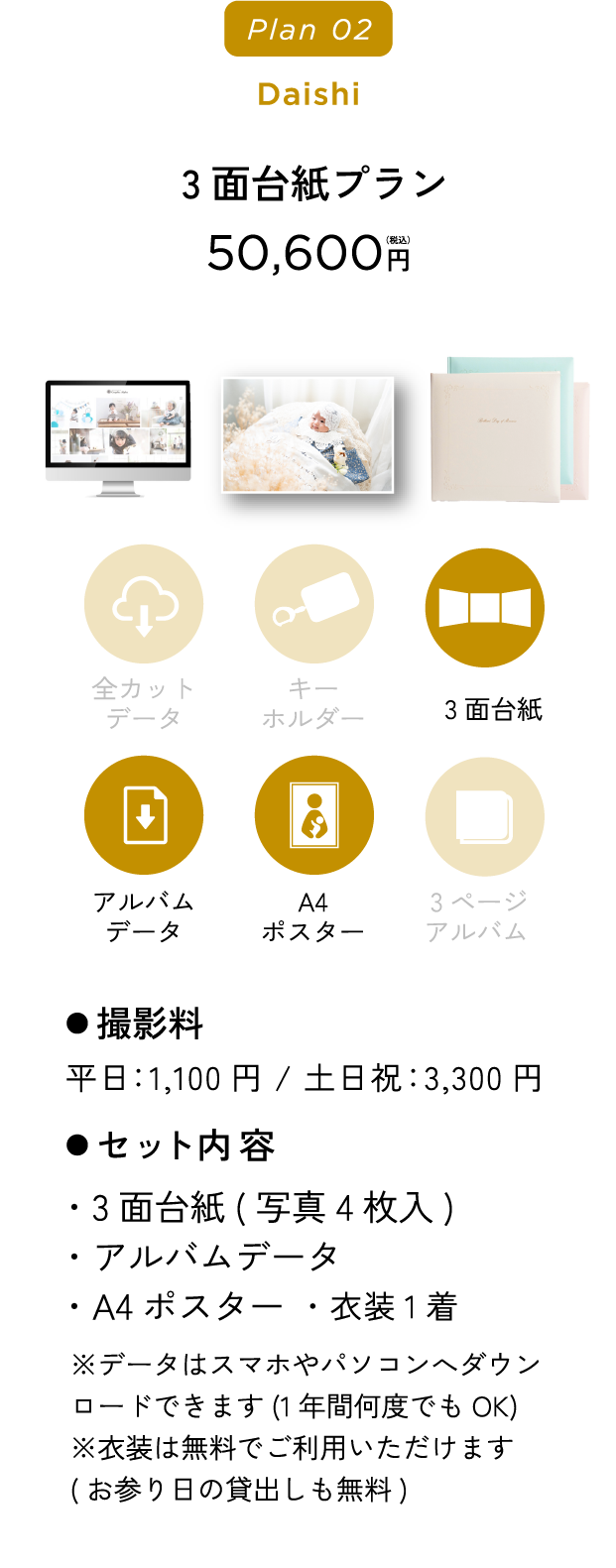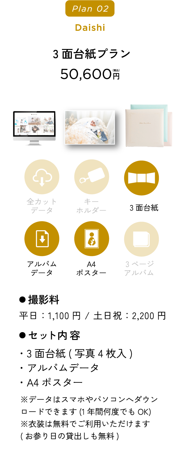 『赤ちゃんの撮影は平日ママとご来店いただきゆっくり撮影して、パパもご一緒の家族写真は土日祝に撮影、そのままお出掛け』というプランも人気です。(平日料金が一回のみでOK)詳しくはお電話でお問い合わせください。