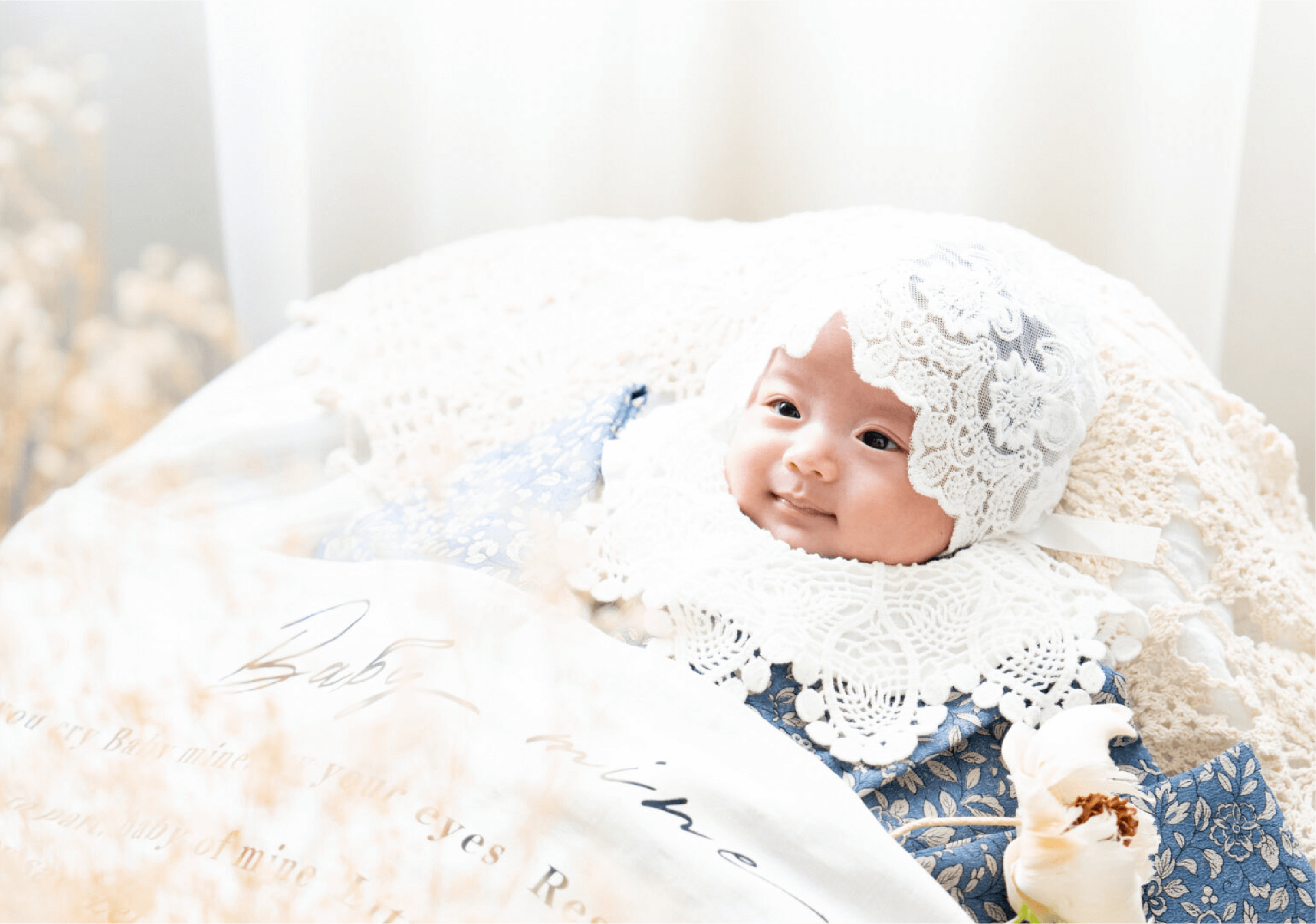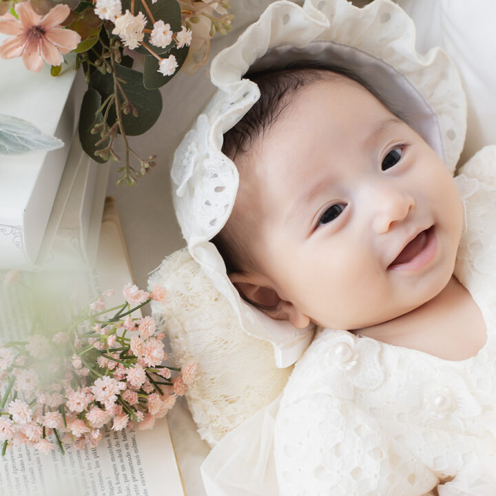 個人差はございますが、お首が座り始めて目も見え始めた頃以降は、撮影中に笑ってくれることがございます。