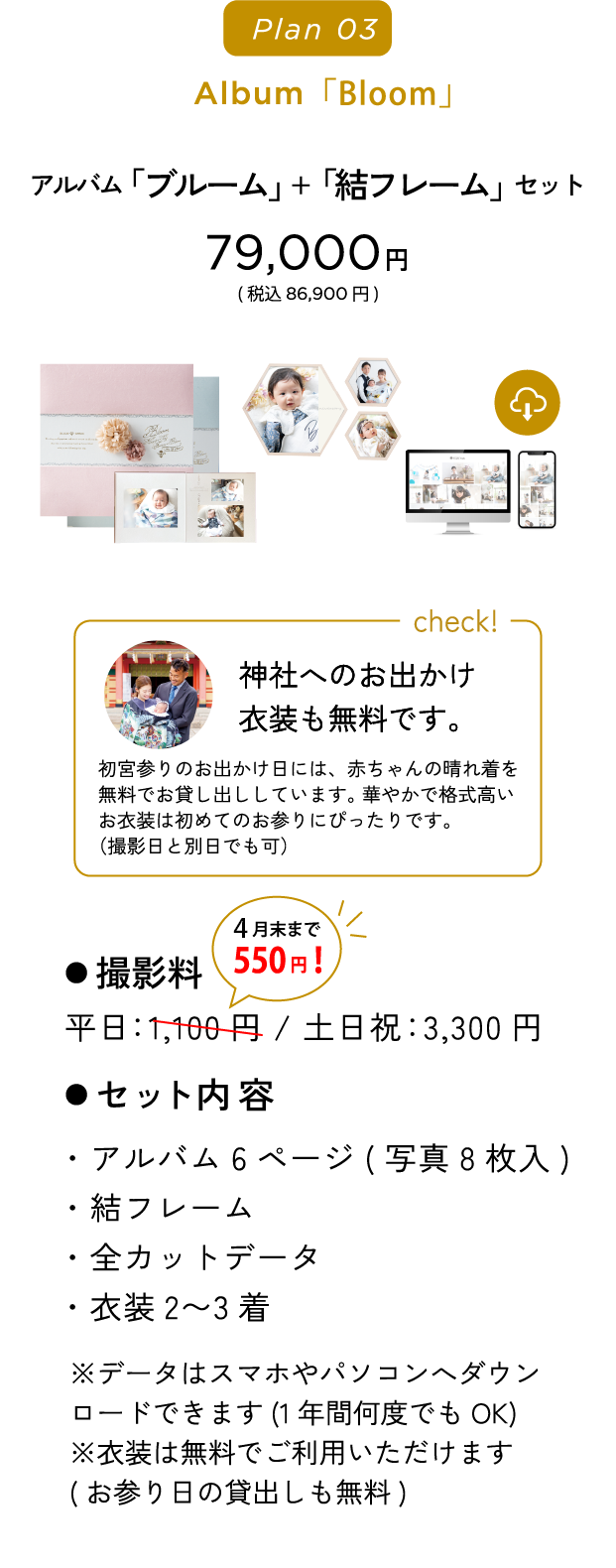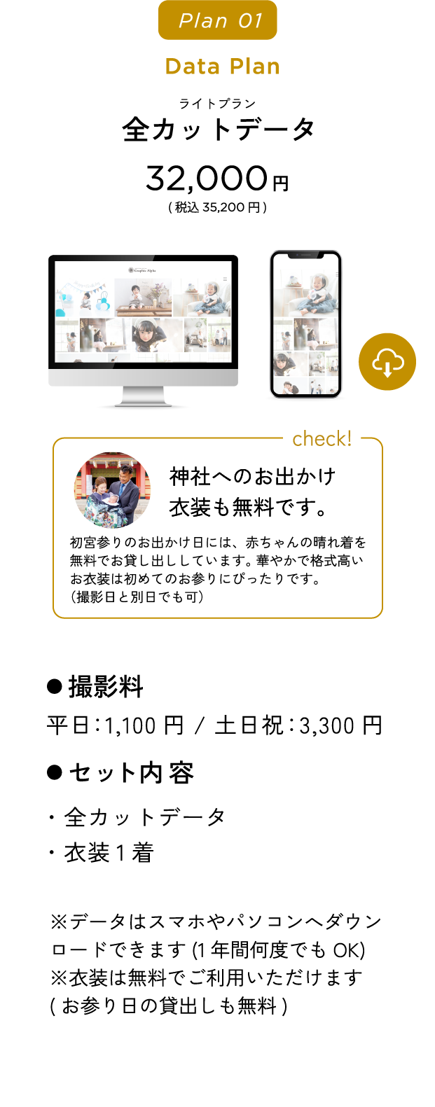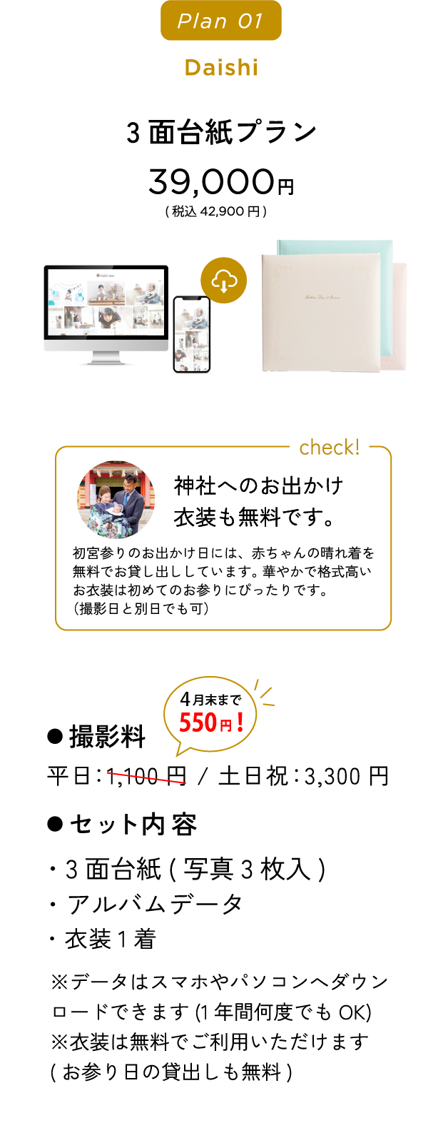 初宮参りのお出かけ日には、赤ちゃんの晴れ着を無料でお貸し出ししています。華やかで格式高いお衣装は初めてのお参りにぴったりです。(撮影日と別日でも可)