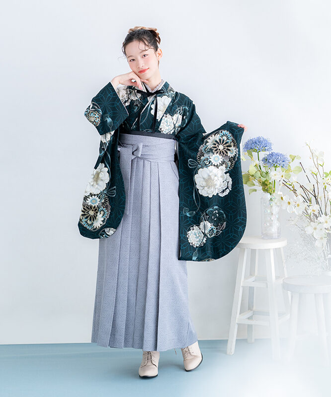 h957 うすグリーン雪輪小槌に花×アイボリー袴